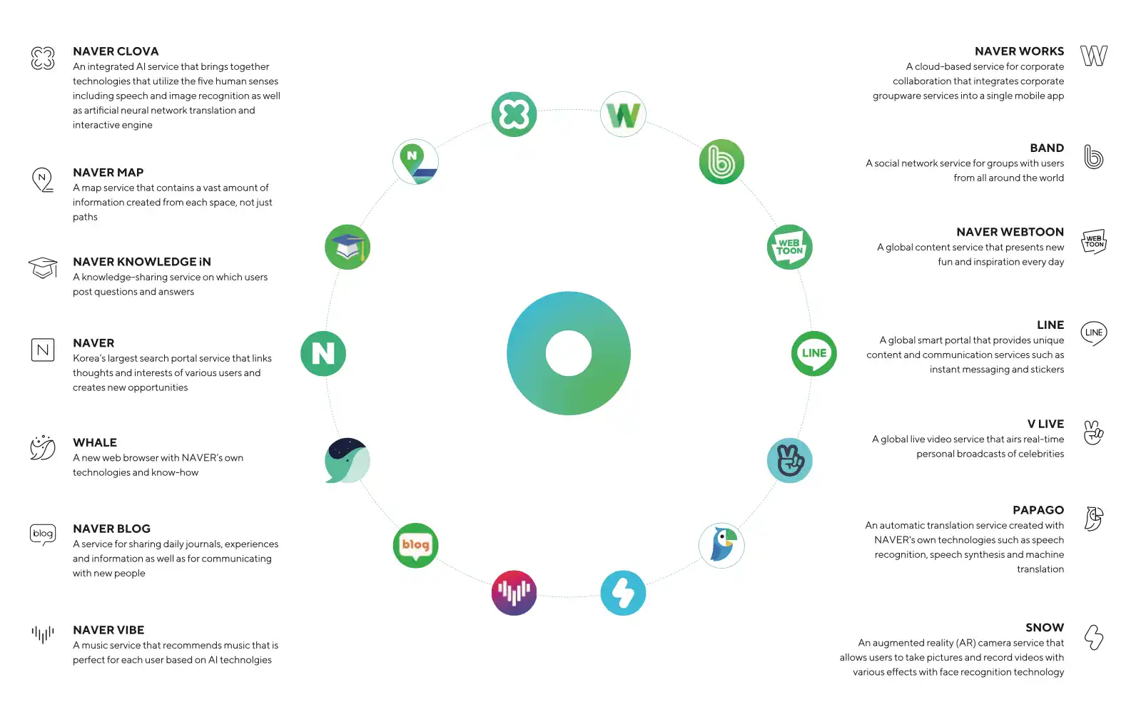 与全球其他科技巨头类似,Naver 通过核心平台(搜索引擎)获取用户,然后不断扩展服务,形成一个用户难以离开的生态系统。
