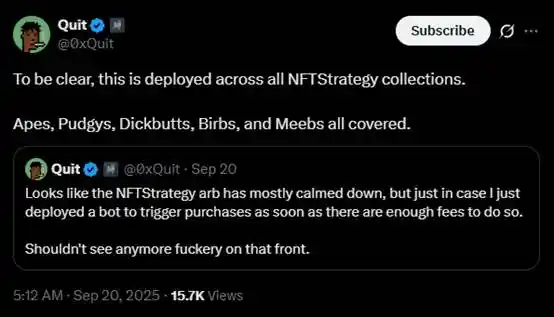 可能是由于团队工作量过载,TokenWorks 并没有部署相应的机器人来确保资金达到**可购买数额时立即买入。不过,这个问题似乎并没有影响新**的表现,而 Yuga Labs 区块链部门的 VP @0xQuit 也表示,他个人已经部署了一个机器人来解决这个问题。