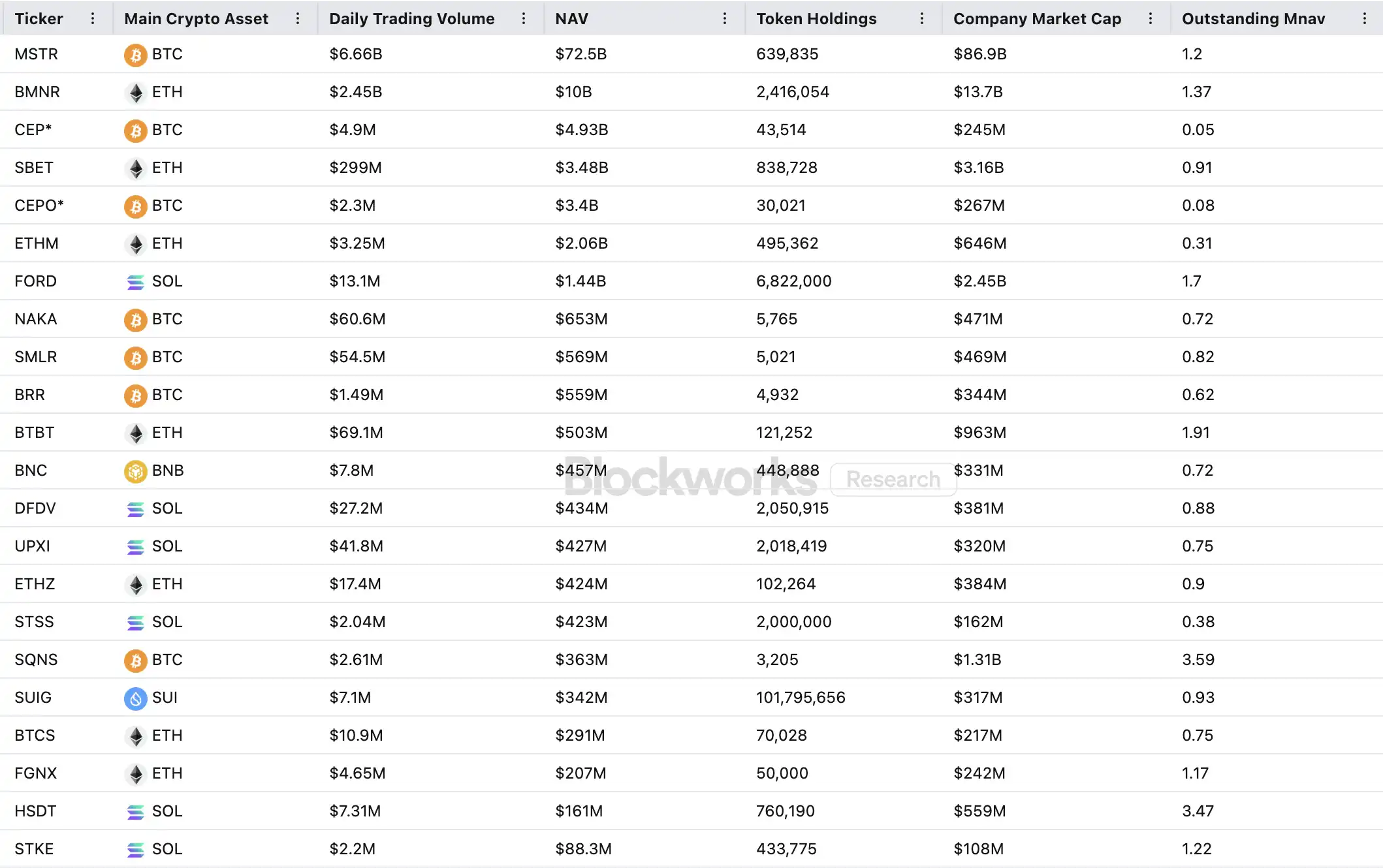 然而,这场资本狂欢在推高价格的同时,也引发了广泛质疑。MSTR 的 mNAV(市值与账面资产净值之比)一个月内从 1.6 跌至 1.2,而前二十家加密财库公司的 mNAV 更有三分之二低于 1。有关资产泡沫、内幕交易等质疑声层出不穷,当下这一新型资产配置潮流正面临前所未有的监管挑战。