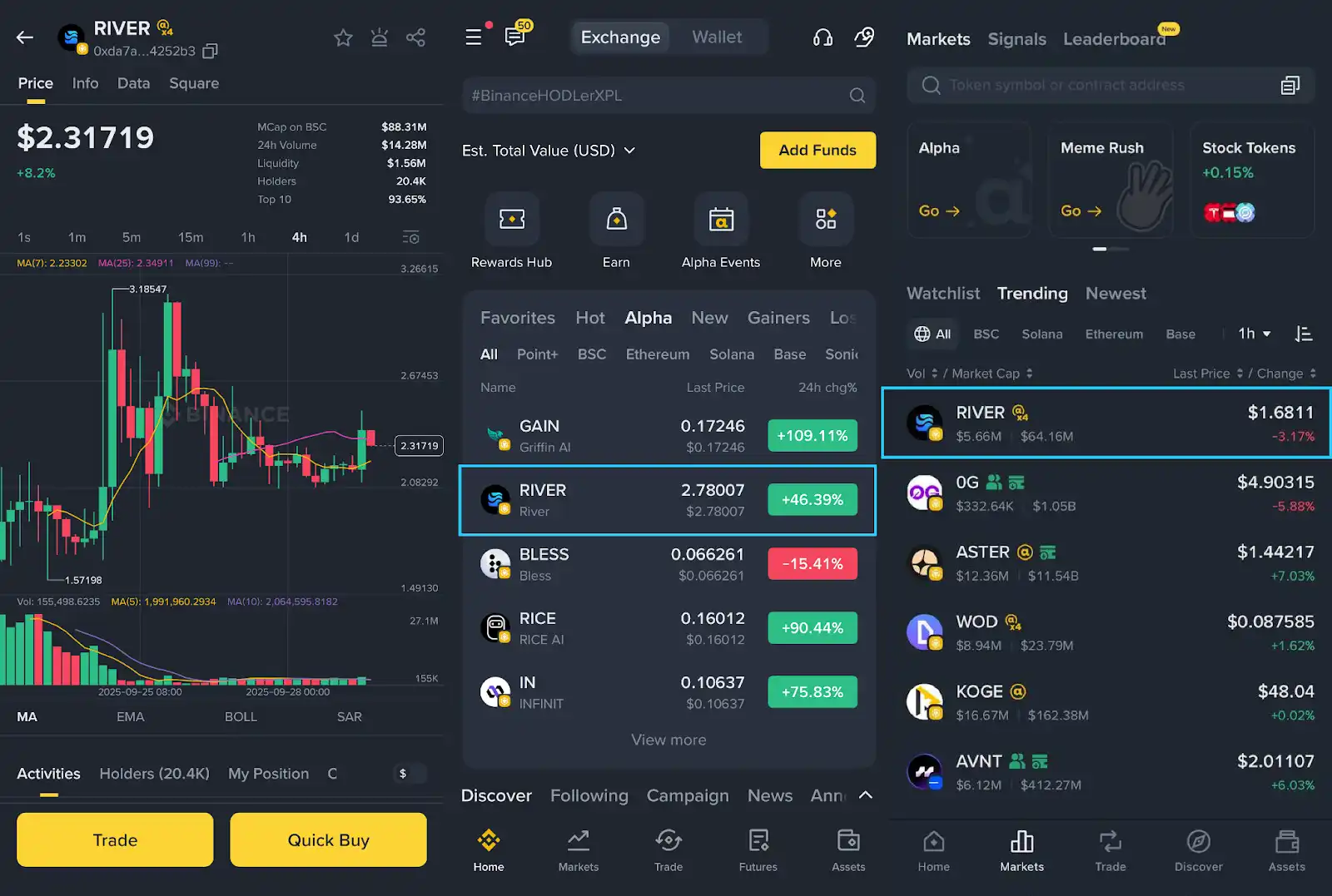 9 月 25 日,$RIVER 在 Binance Alpha 上线后迅速拉升,**触及 3.1 美元,相较 IDO 价格上涨 6200%,还上线了 Bitget 等多家**交易平台。
