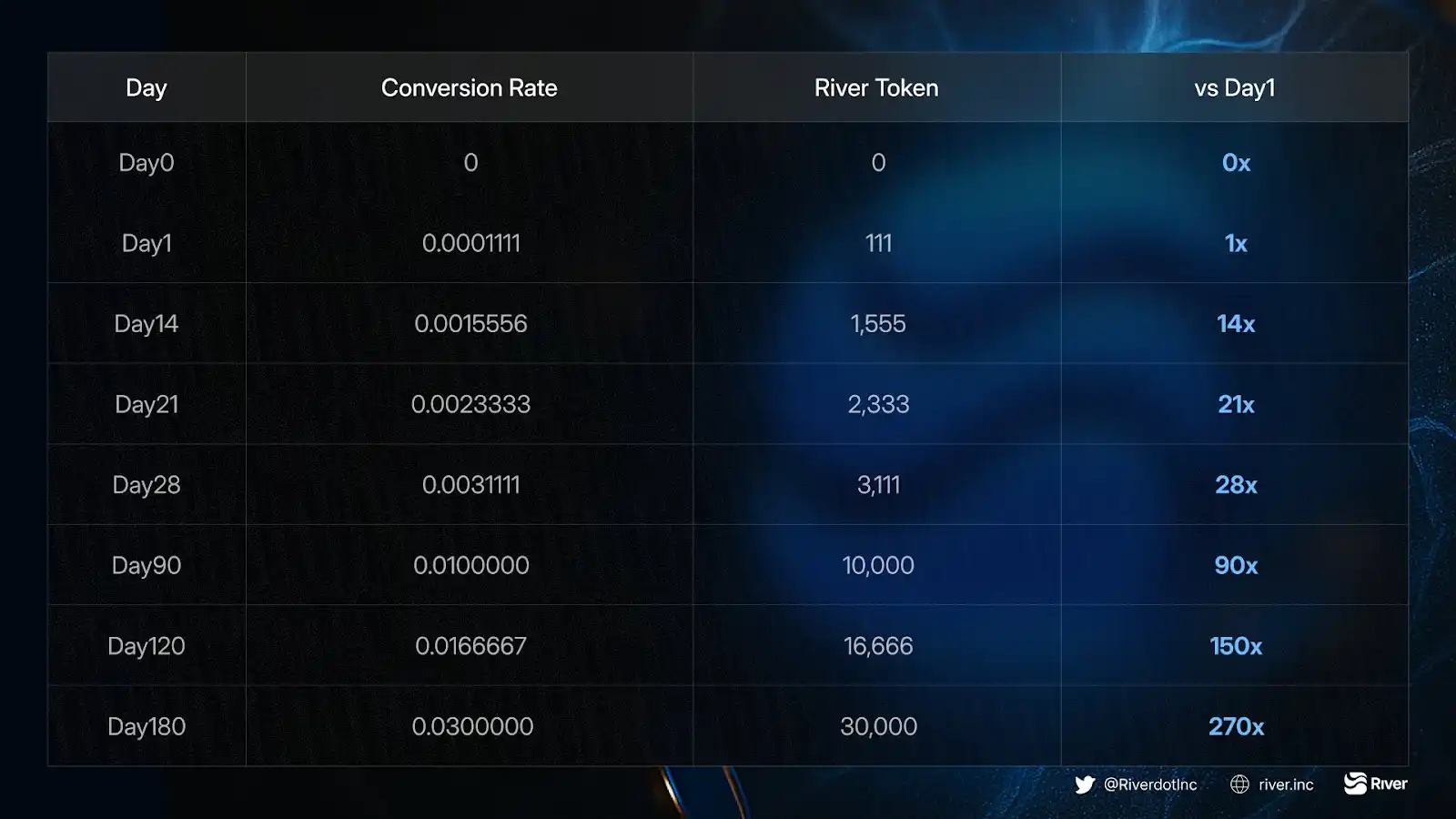 真正的关键在于:比例并非固定,而是随时间不断提升。你等待的时间越久,手中的 River Pts 能兑换到的 RIVER **就越多。假设你目前持有 1M(百万)River Pts,根据在第 1 天、90 天、180 天兑换,会对应不同数量的 RIVER **。