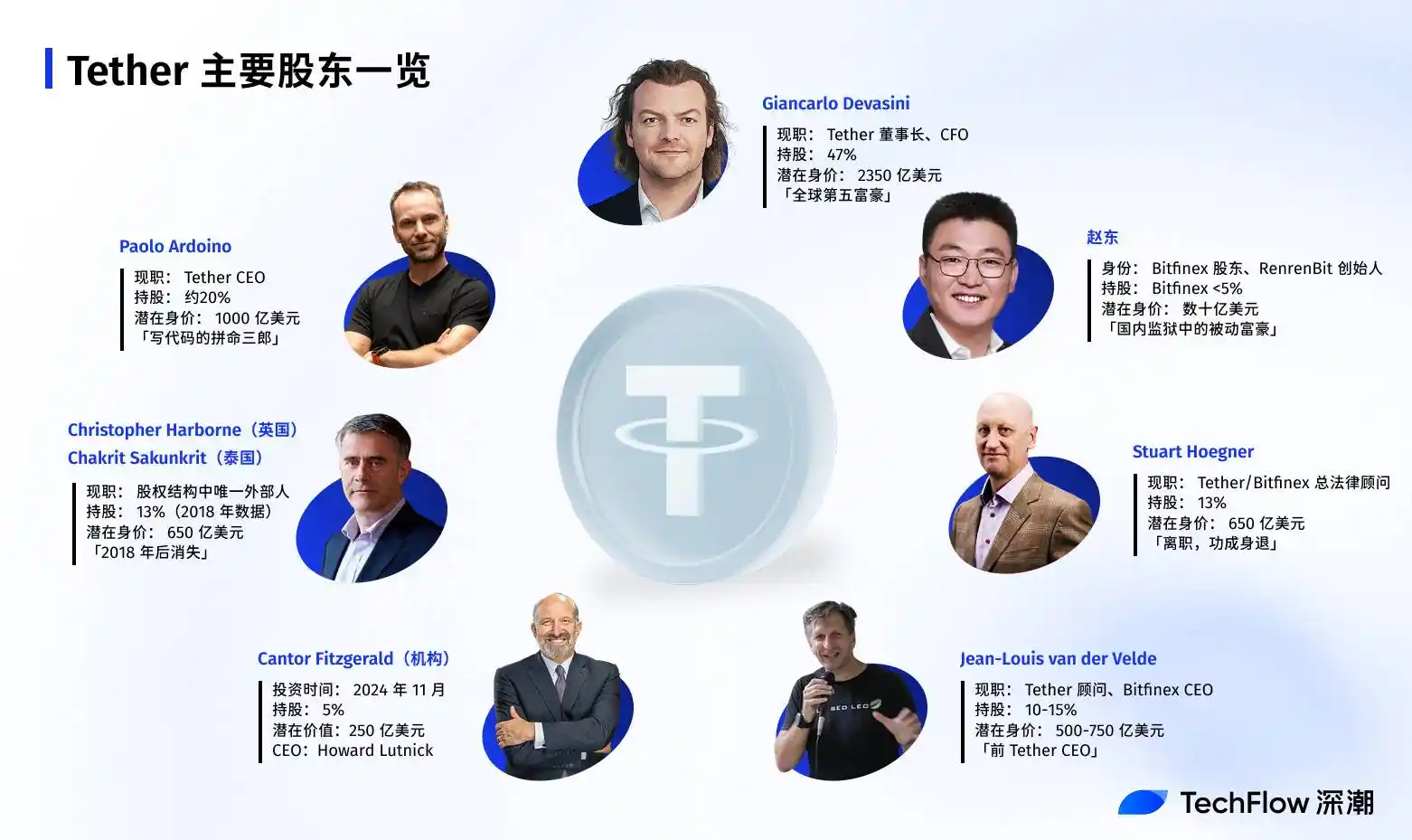 这是 Tether 股权结构中**的「外部人」。既不是创始团队,也不是高管,却持有与总法律顾问相当的股份。