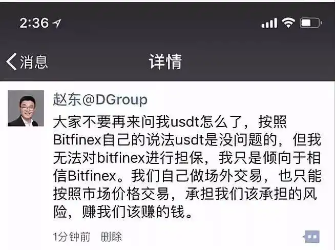 2018 年 1 月,赵东在微博上发文称,在东京与 Tether CFO Giancarlo 会面时,看到了超过 30 亿美元的银行账户余额。作为币圈的知名人物,他的这种表态引发了广泛关注。
