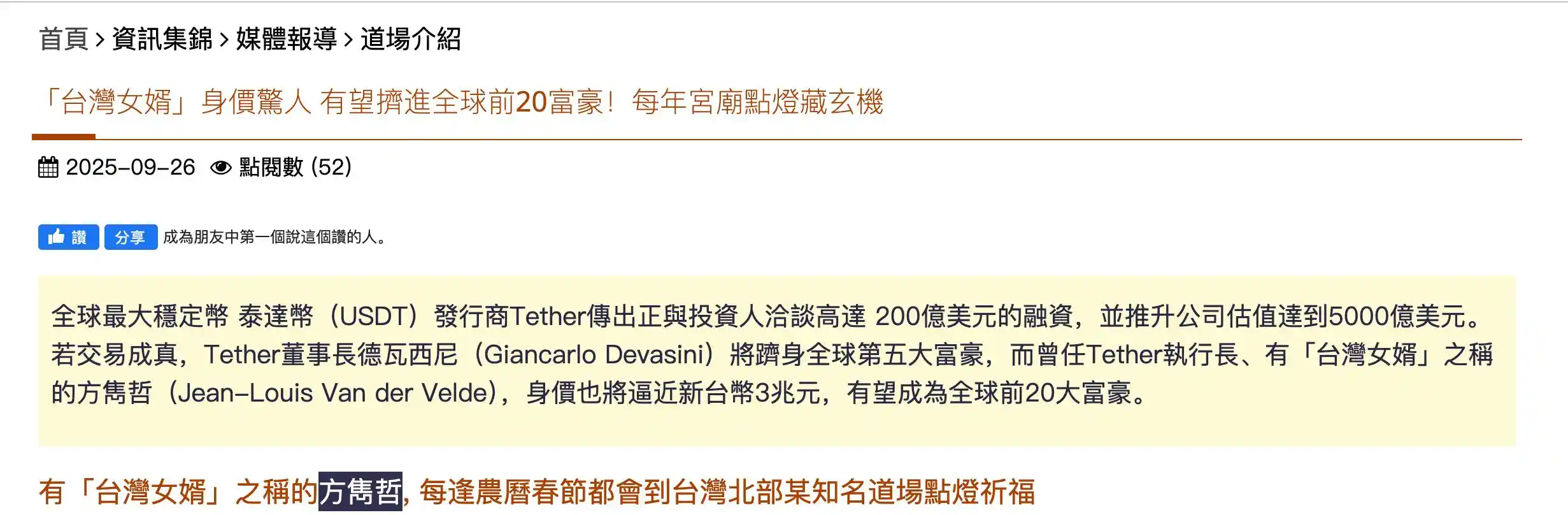 更重要的是,他是 Tether 在**的非官方「代言人」。