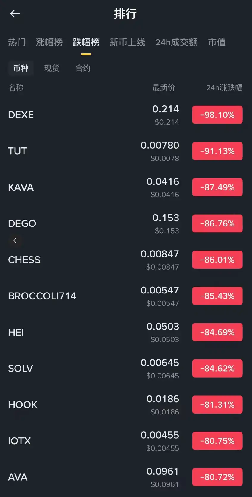 迟到的消息再炸裂也不重要了,山寨币已经血流成河。随便举几个主流大市值的山寨为例:SUI,前几天一直 3.5 美元,一根针扎到 0.55 美元;WLD,AI 龙头从 1.4 美元一根针扎到 0.26 美元;甚至市值前十大的狗狗币,也是 50% 的跌幅。
