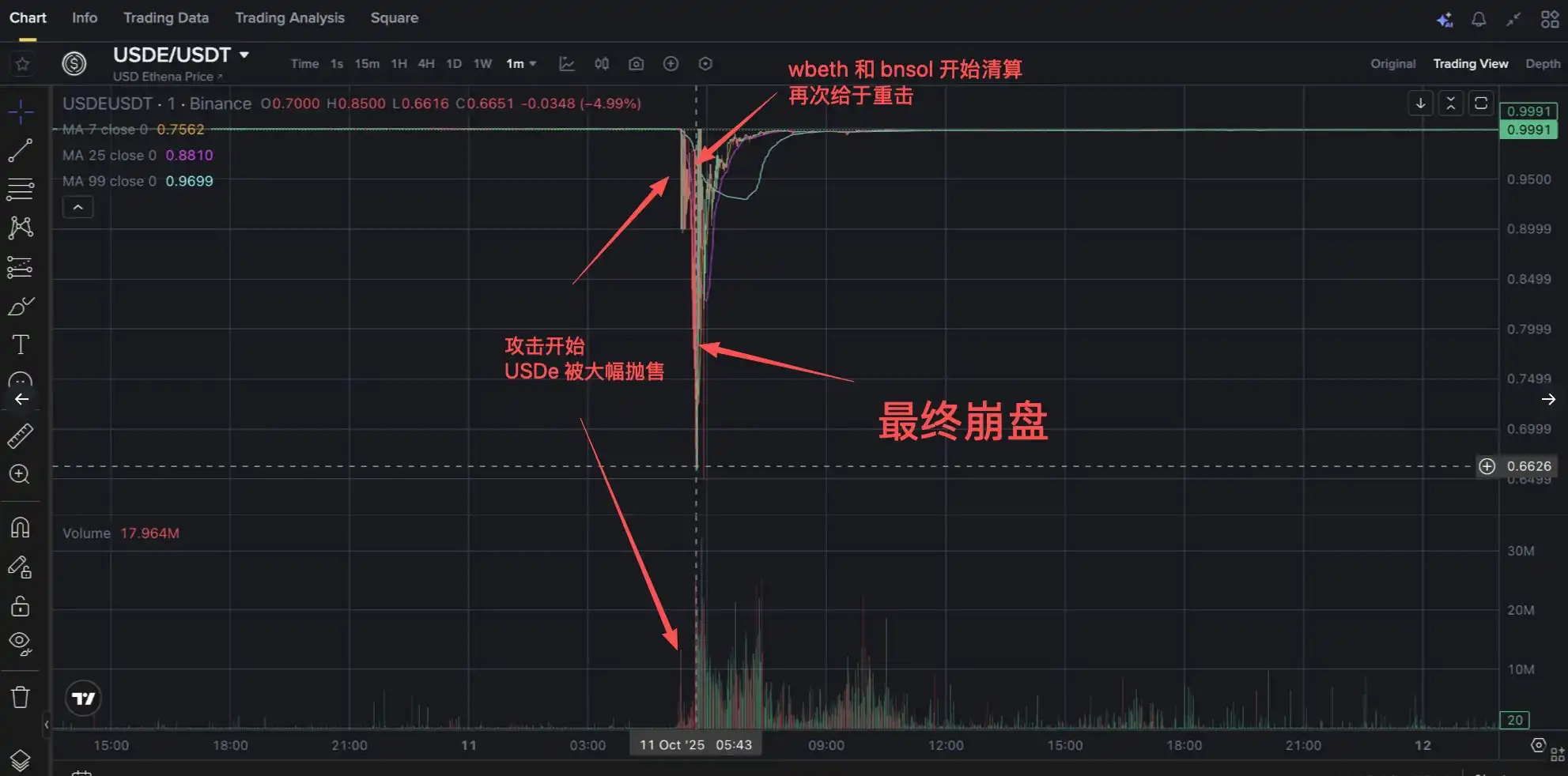 **达到脱锚**:USDe 0.65 wBETH 跌至$430,BNSOL 跌至$34.90