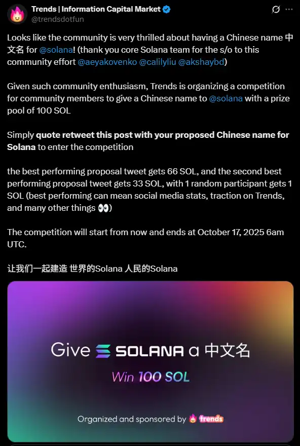 这是个挺有意思的事,几天前,社交协议平台 Trends 启动「为 Solana 征集中文名」活动,同时为活动设置了 100 SOL 奖池。用户引用转发官方推文并写上为 Solana 提议的中文名即可参加。奖励规则为表现**的提案推文获得 66 SOL,第二名获得 33 SOL,另随机抽出 1 名参与者获得 1 SOL。毕竟现在中文 meme 情绪火爆,100SOL 的奖励也相当吸睛。