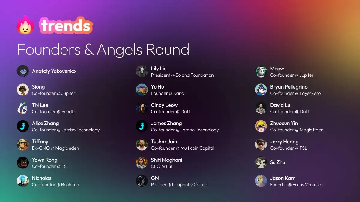 大家可能都认为,「Internet Capital Market 互联网资本市场」是当前受到 Solana **扶持的赛道,但 Trends.fun 做的「Information Capital Market 信息资本市场」同样得到了 Solana 的大力支持。在各类 meme 发射台陷入同质化竞争的情况下,Trends.fun 的「推文**化」受到一众业内明星人物的支持,看看下面这份星光熠熠的投资者名单就能感受到: