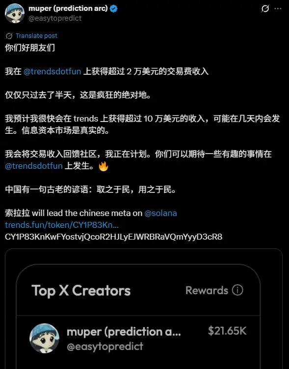 除了活动本身的 66 SOL 奖励外,「索拉拉」中文的提出人 muper 在今早 10 点半左右就已经获得了超过 2 万美元的创作者收入。他预计自己很快会在 Trends 平台上获得超过 10 万美元的创作者收入,并承诺会将收入回馈社区。