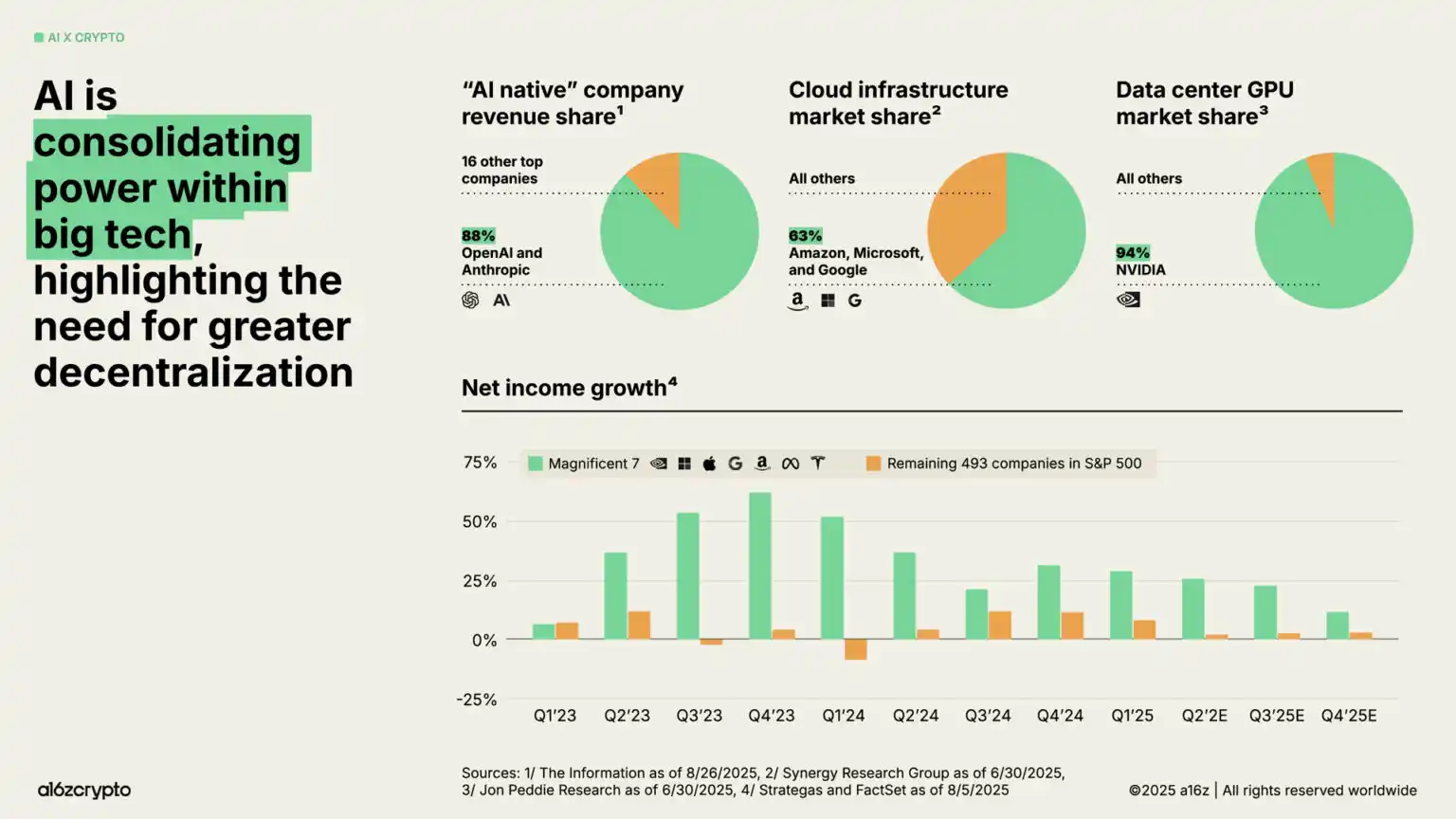 与此同时,人工智能的计算层正围绕少数科技巨头整合,引发了对**化与审查的担忧。目前仅 OpenAI 和 Anthropic 两家公司就掌控了 88% 的「AI 原生」企业收入,亚马逊、微软和谷歌占据云基础设施市场 63% 的份额,而英伟达则持有数据** GPU 市场 94% 的份额。这种失衡使得"七巨头"公司连续多个季度实现两位数净利润增长,而标普 500 其余 493 家企业的盈利增长总体未能跑赢通胀。