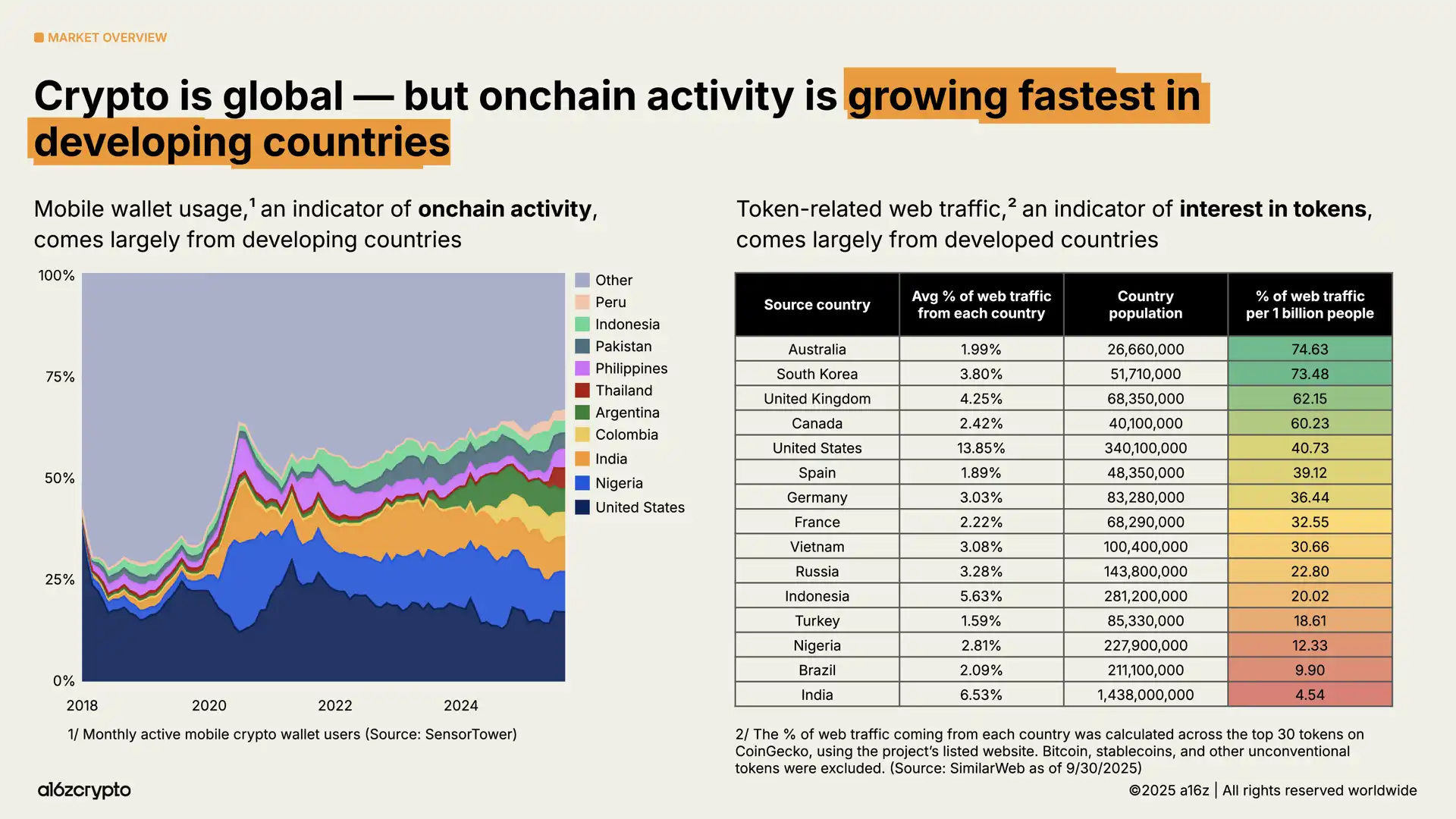 加密生态具有全球性特征,但世界不同地区呈现出差异化使用模式。作为链上活动指标的移动钱包使用量,在阿根廷、哥伦比亚、印度和尼日利亚等新兴市场增长最快(特别是阿根廷在过去三年货币危机持续升级的背景下,加密移动钱包使用量激增 16 倍)。