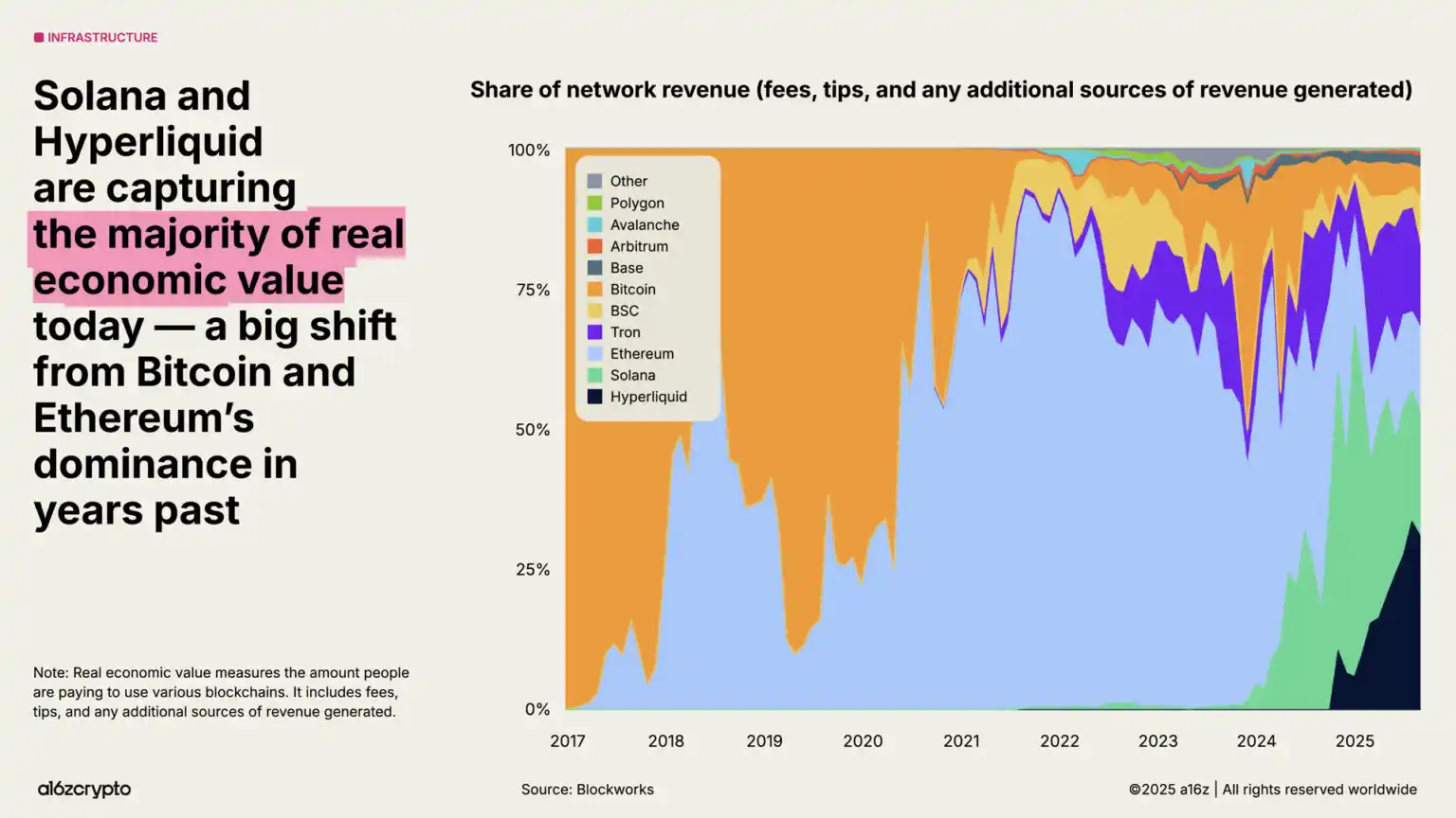 随着区块链持续扩容、费用市场日趋成熟以及新应用不断涌现,某些指标正变得愈发重要,「真实经济价值」便是其中之一——它衡量用户实际为使用区块链支付的费用规模。当前 Hyperliquid 和 Solana 占据创收经济活动的 53%,这与早先比特币和以太坊的主导格局形成显著转变。