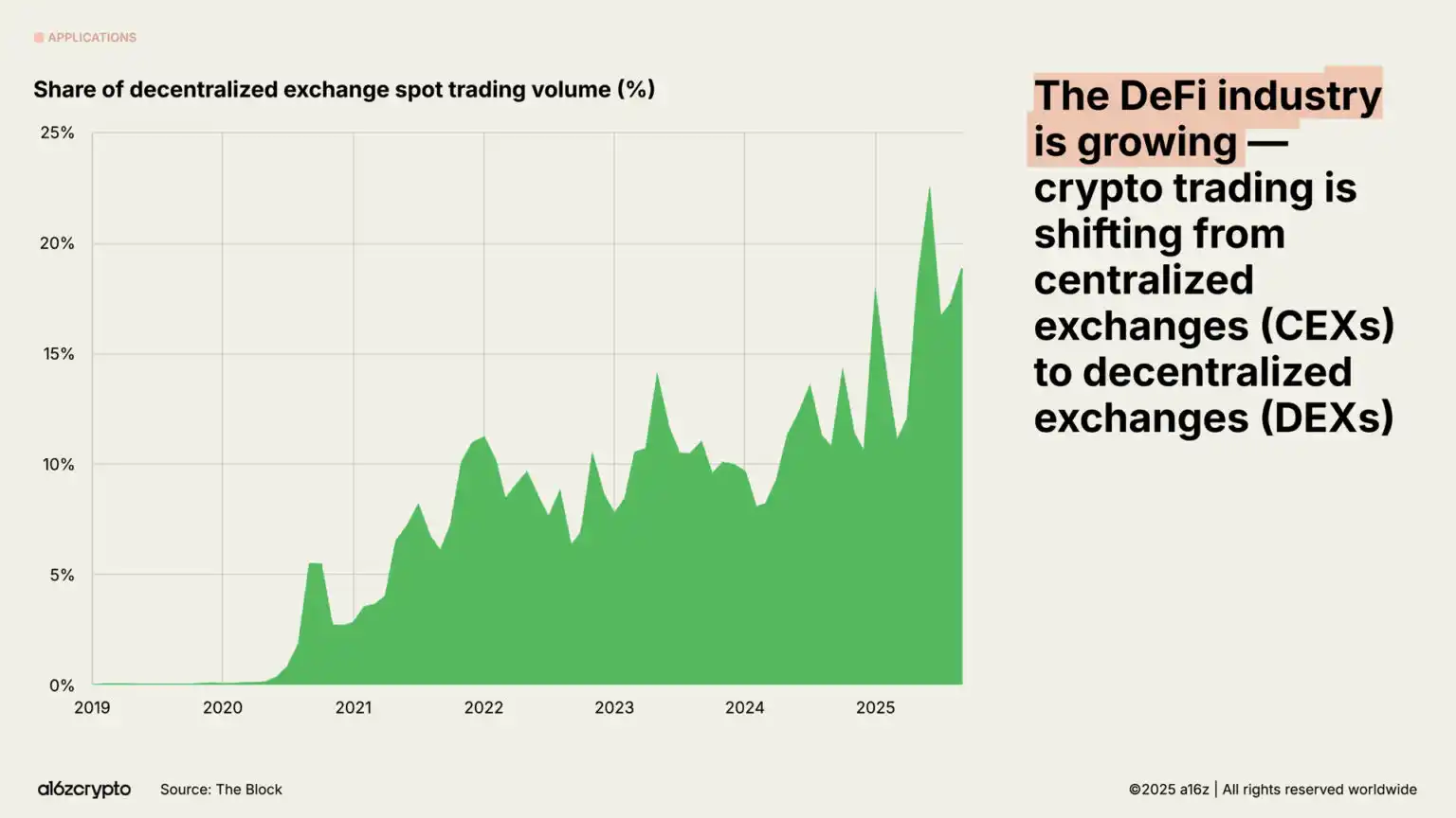 曾经仅是早期采用者小众试验场的链上经济,已演变为拥有数千万月活参与者的多元生态。如今近五分之一的现货交易量通过去**化交易平台完成。