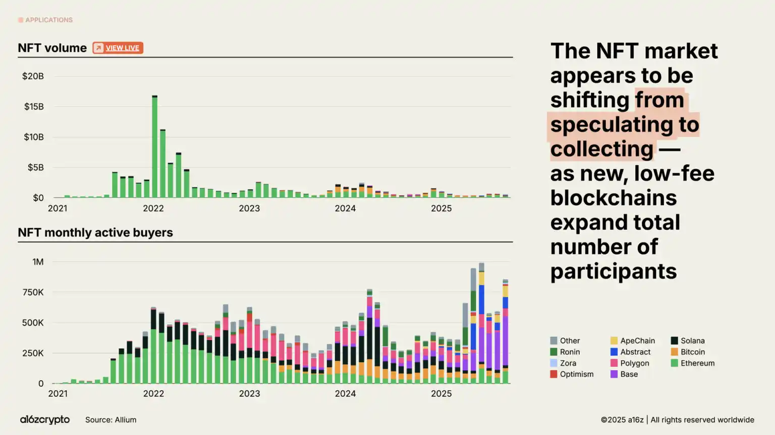 NFT 市场交易量虽未重返 2022 年峰值,但月活跃买家数量持续增长。这些趋势似乎预示着消费者行为正从投机转向收藏,而 Solana、Base 等链上更低廉的区块空间成本为此提供了条件。