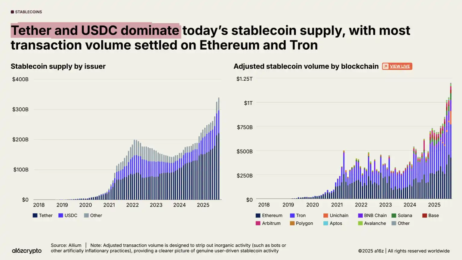 市场由头部稳定币主导:Tether 和 USDC 占总供应量的 87%。2025 年 9 月,以太坊和波场区块链处理的稳定币交易额(经调整后)达 7720 亿美元,占**交易量的 64%。尽管这两大发行方和区块链占据了稳定币活动的主要份额,但新兴区块链和发行方的增长势头也在加速。