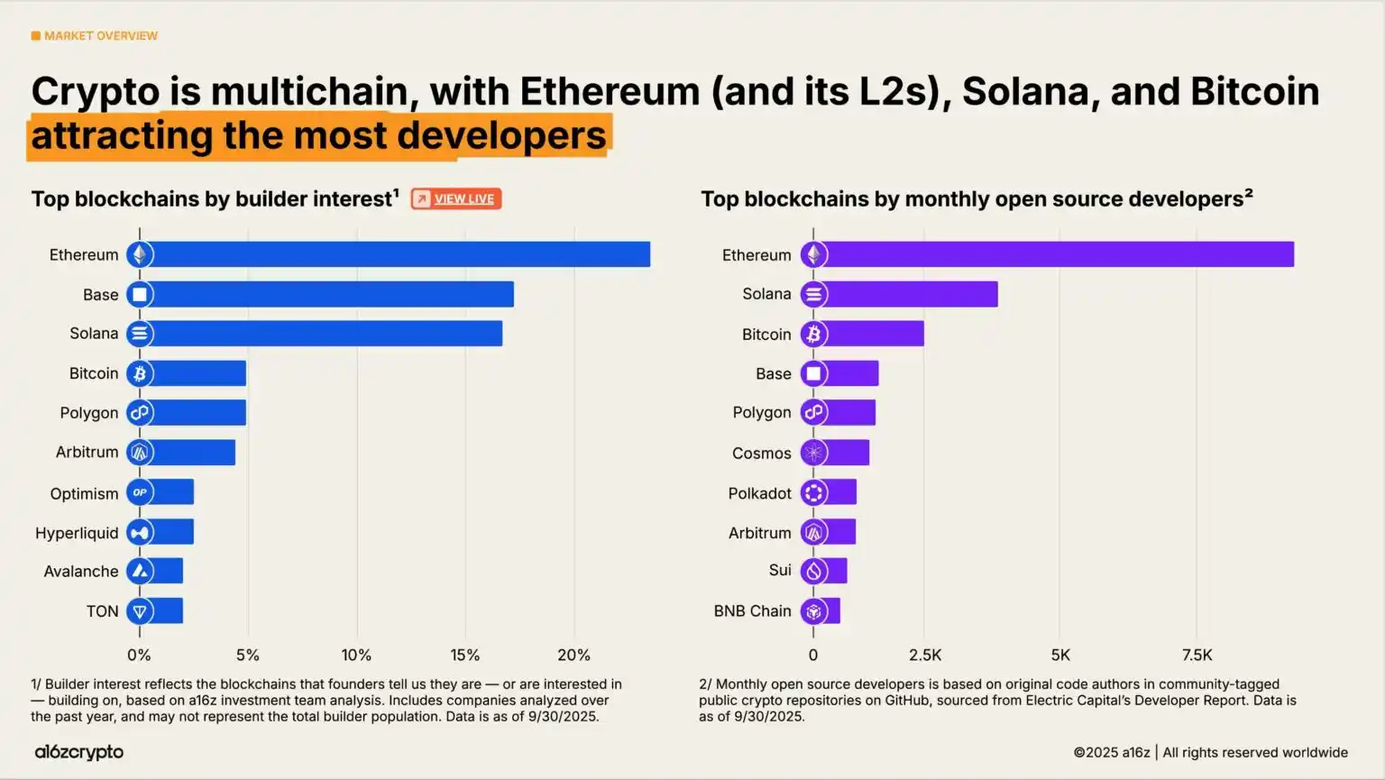 从开发者生态来看,加密世界仍呈现多链格局,比特币、以太坊及其二层网络、Solana 构成三大核心开发者聚集地。2025 年以太坊及其二层网络成为新开发者的**目标,而 Solana 则是增长最快的生态之一——过去两年开发者兴趣增幅达 78%。这一数据源自 a16z 加密投资团队对创业者**开发平台的调研分析。