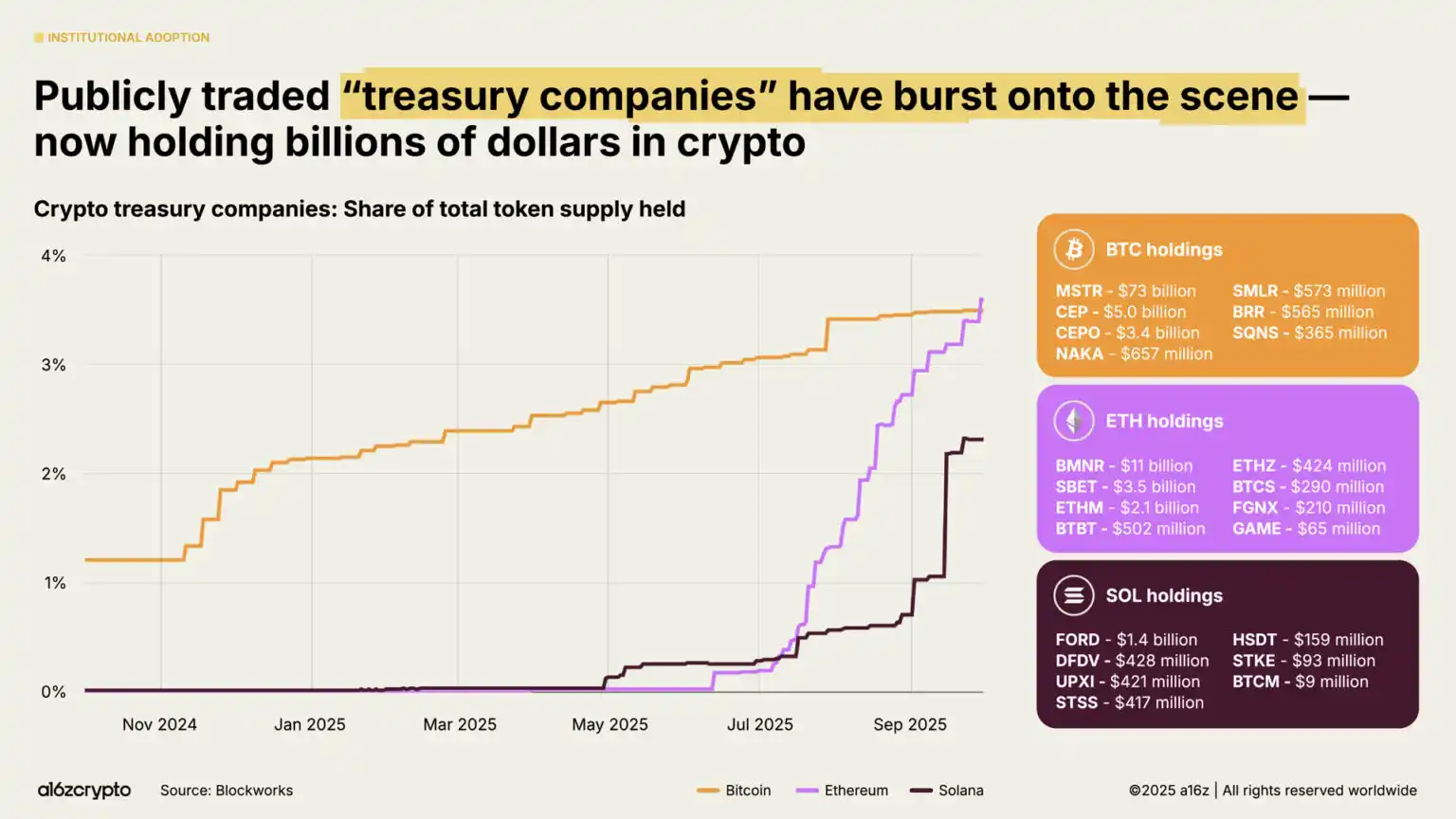 公开交易的「数字资产储备」公司——即在资产负债表中持有加密资产(类似企业国库持有现金的实体),目前合计持有流通中比特币和以太坊总量的约 4%。这类数字资产储备公司与交易所交易产品现合计持有约 10% 的比特币和以太坊流通供应量。