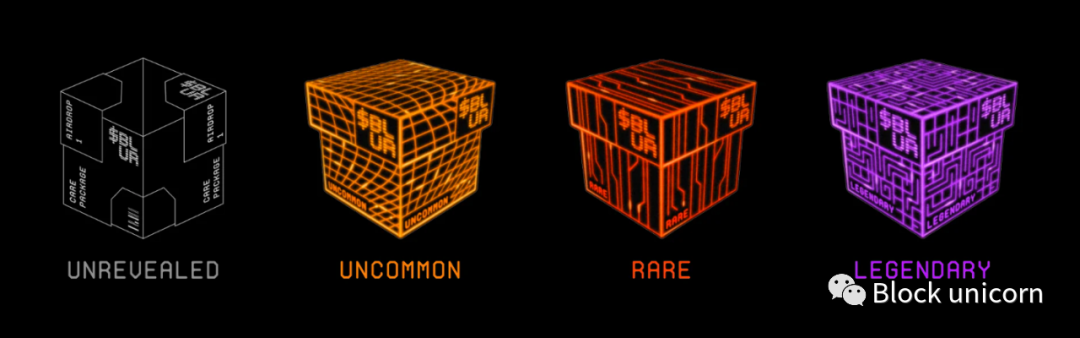 关爱包裹关爱包裹有四个不同的稀有程度:普通,稀有,传奇,神话。关怀包裹的稀有性与用户对Blur的忠诚度分数挂钩,这区分了诸如列出普通NFT或蓝筹NFT的行为,罕见的包裹将获得更多的**。