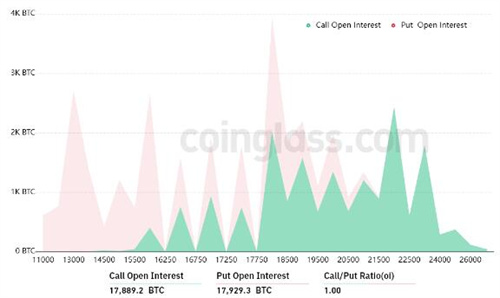 1.00 的看涨期权与看跌期权比率显示了 3 亿美元的看跌(卖出)未平仓合约和 3 亿美元的看涨(买入)期权之间的**平衡。然而,随着比特币接近 16,500 美元,大多数看涨押注将变得毫无价值。