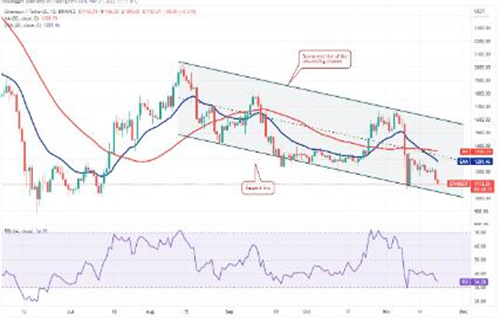 然后 ETH/USDT 货币对可能跌至 1,000 美元的心理水平,然后跌至重要支撑位 881 美元。向下倾斜的 20 日均线 1,381 美元和 RSI 处于负区域表明空头处于控制之中。