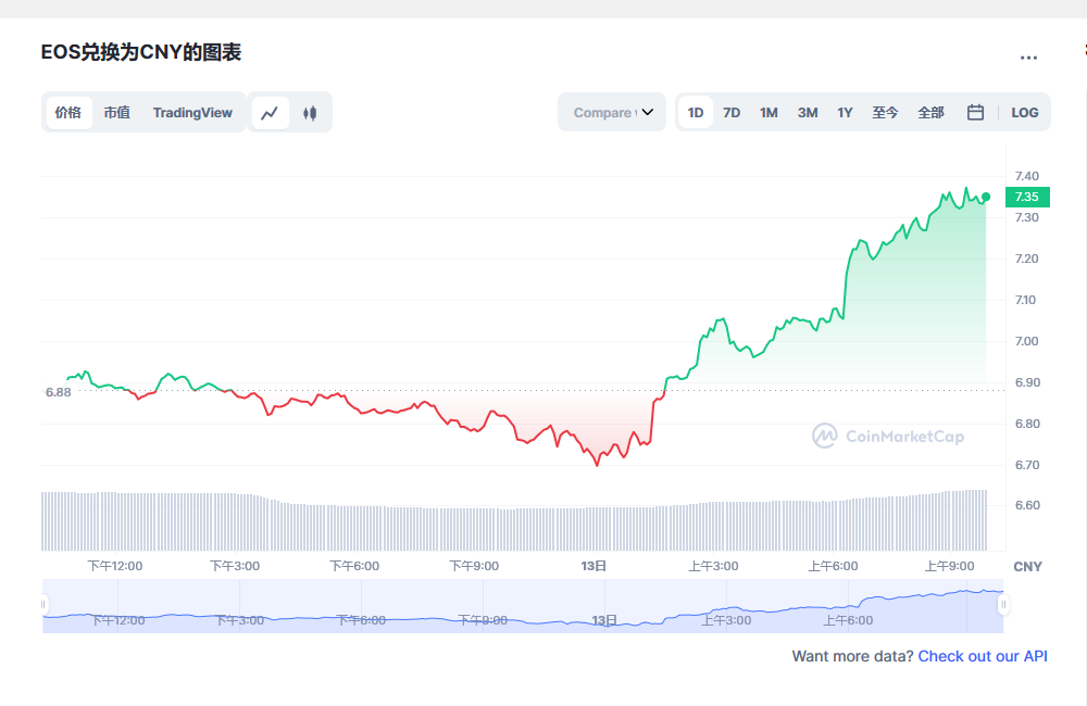 EOS 今日价格 为 ¥7.34 CNY,其 24 小时的交易量为 ¥1,544,033,722 CNY。EOS 在过去 24 小时内增长了 6.47。 目前的 CoinMarketCap 排名为第 #42 位,其市值为 ¥7,936,343,146 CNY。 其流通供给量为 1,081,263,745 EOS 个货币。