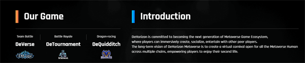 2022 年**季度,发布 DeHorizon 元节预告片 发布 DeVerse 游戏演示 发布 DeVerse Alpha; 2022 年第二季度,在 DEX 上启动 DeTournament Alpha List DTT; 2022 年第三季度,启动 DeQuidditch Alpha; 2022 年第四季度,启动 DeHorizon 嘉年华。DeHorizon 旨在成为下一代元界游戏生态系统,使玩家能够与朋友一起创建、社交和享受基于区块链的游戏。DeHorizon metaverse 的长期愿景是创建一个虚拟嘉年华,对跨多个链的所有 metaverse 居民开放,让玩家享受第二人生。