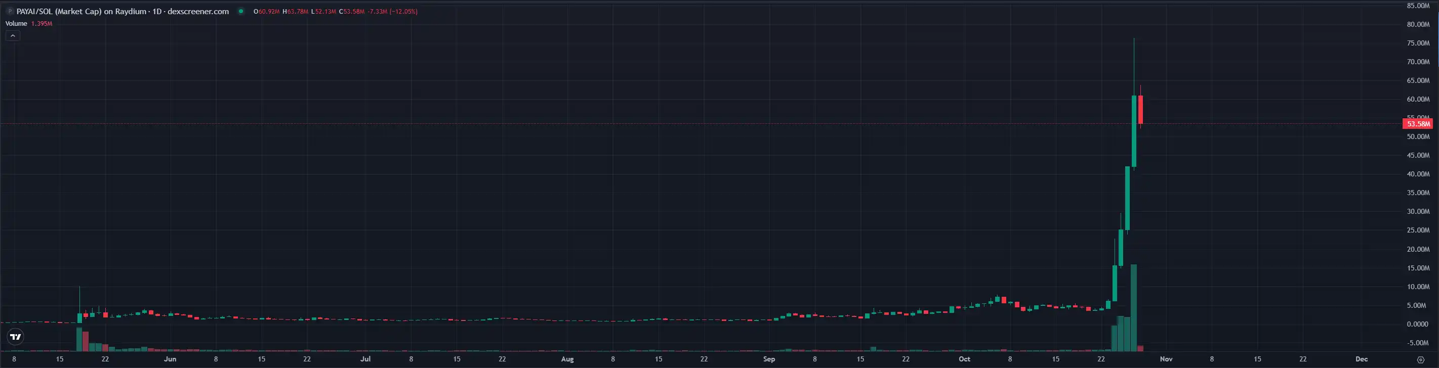$PAYAI 后发制人,成为了 x402 协议的新龙头。昨天,$PAYAI 市值一度突破 7600 万美元,自 10 月 24 日以来**上涨了约 12 倍。目前,该币出现回落,市值约为 5300 万美元。