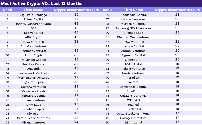 按基金规模来看,**的以加密货币为**的 VC 公司是: A16Z Crypto、Binance Labs、Multicoin、Pantera 和 Paradigm。 按**加密货币投资数量来看,前五大以加密货币为**的 VC 公司是: Coinbase Ventures、DCG、NGC、AU21 和 Animoca。但在过去 12 个月里,哪些公司在新的加密货币 VC 投资领域处于**地位呢?