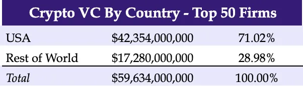 美国在加密货币风险投资领域占据主导地位,至少在按基金规模排名前 50 的公司中是如此。