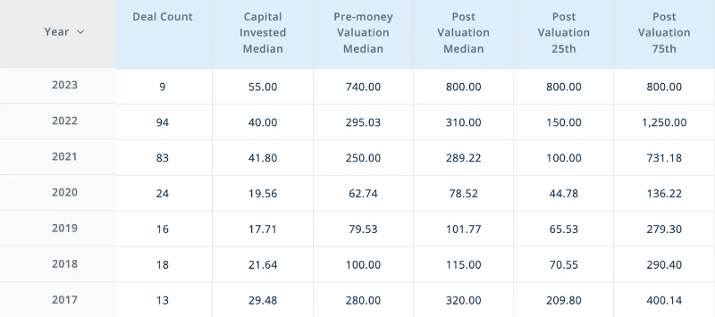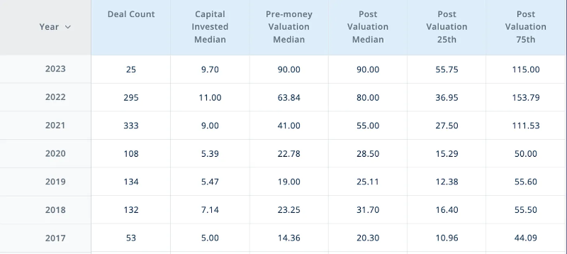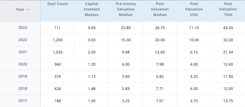 正如下面所示,2023 年的中位种子轮筹资额为 300 万美元,预估前置估值为 2280 万美元,其中估值范围从 1100 万美元到 4300 万美元。