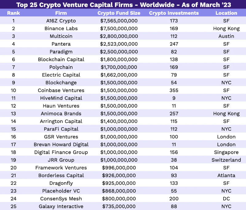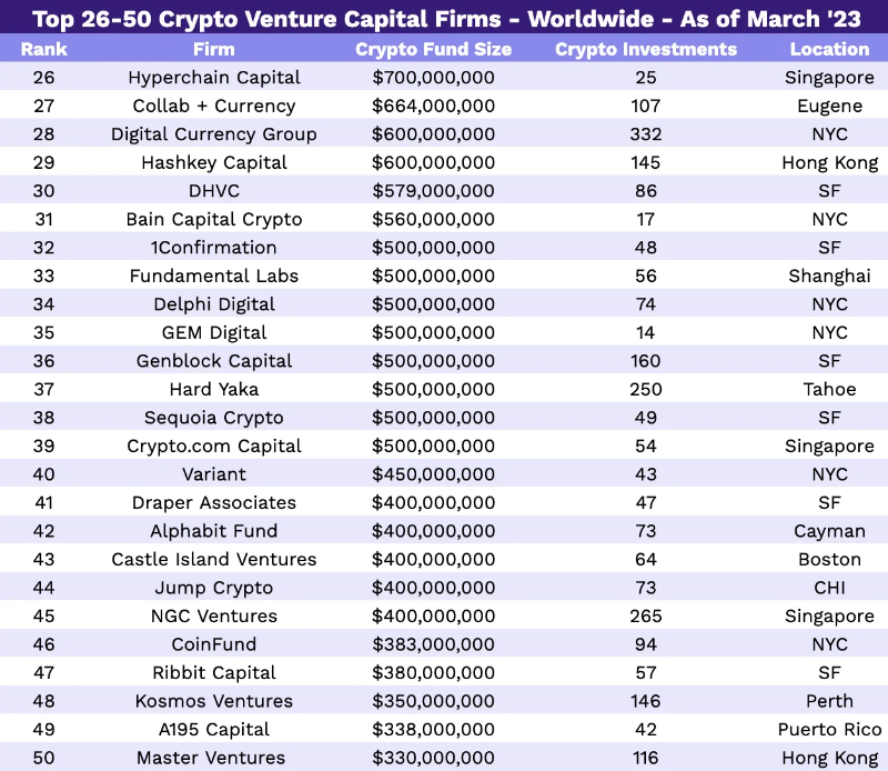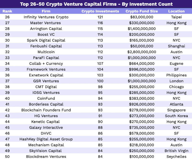 以下是按基金规模排名的前 50 家公司。根据我们的研究,有 19 家加密货币风险投资公司将 10 亿美元或更多资金专门用于加密货币投资。