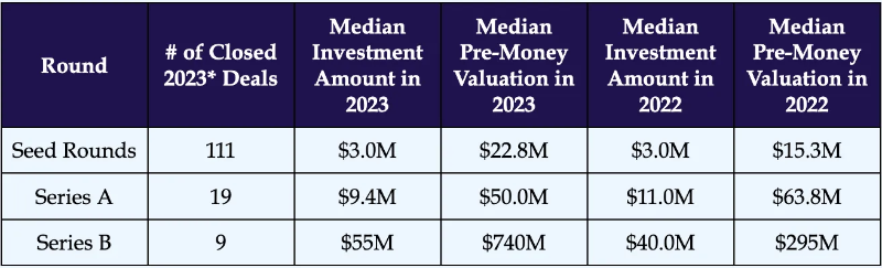 2023 年的中位 A 轮筹资额为 970 万美元,预估前置估值为 9000 万美元,其中估值范围从 5500 万美元到 1.15 亿美元。这些 A 轮交易往往是分配给年收入在 100 万到 1000 万美元之间、已实现产品市场契合并在当前经济低迷期间逐月增长的公司的。