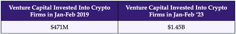如果放眼更广阔的视野,与四年前的同期(2019 年 1 月/2 月)持平,在当前(2023 年 1 月/2 月)正在向公司投资的风险投资资本比先前的熊市时期高出 3.1 倍。