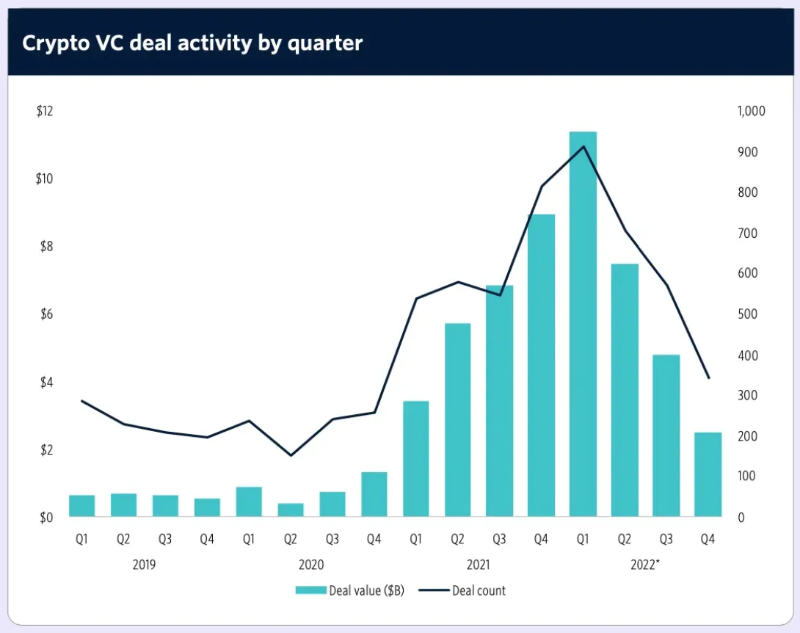 然而,从 Pitchbo抹茶 的季度数据来看,情况又不同。2022 年**季度的活动达到了峰值,新投资了略高于 110 亿美元的资本,而第四季度仅为 25 亿美元。