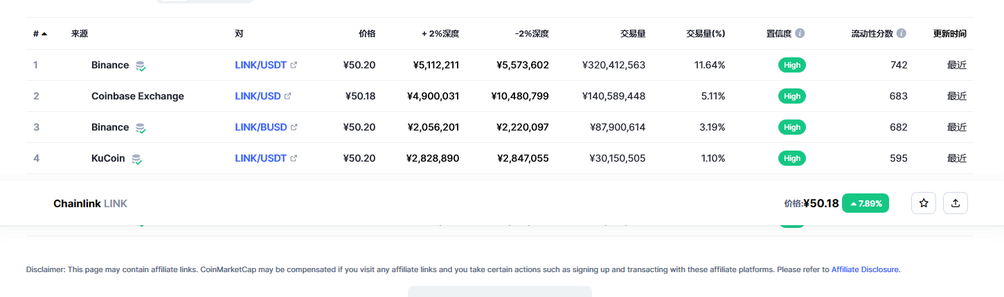 如果您想知道以当前价格在哪里购买link币,目前 Chainlink 交易量**的平台为 Binance, BTCEX, Bitrue, Deepcoin。 您可以在我们的加密交换页面上找到其他列表。