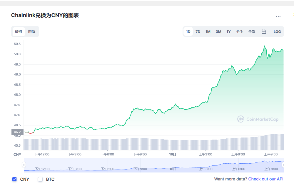 Chainlink 今日价格 为 ¥50.21 CNY,其 24 小时的交易量为 ¥2,752,653,620 CNY。 我们会实时更新LINK兑换为CNY的价格。 Chainlink 在过去 24 小时内增长了 8.47。 目前的 CoinMarketCap 排名为第 #21 位,其市值为 ¥25,504,510,594 CNY。 其流通供给量为 507,999,970 LINK 个货币 此外,供给量上限为1,000,000,000 LINK 个货币。