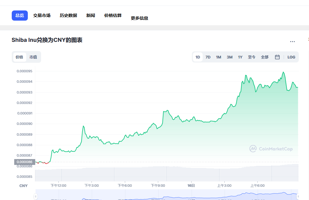Shiba Inu 今日价格 为 ¥0.000093 CNY,其 24 小时的交易量为 ¥3,339,767,135 CNY。 我们会实时更新SHIB兑换为CNY的价格。 Shiba Inu 在过去 24 小时内增长了 7.67。 目前的 CoinMarketCap 排名为第 #13 位,其市值为 ¥51,311,306,501 CNY。 其流通供给量为 549,063,278,876,302 SHIB 个货币 目前无法提供供给量上限信息。