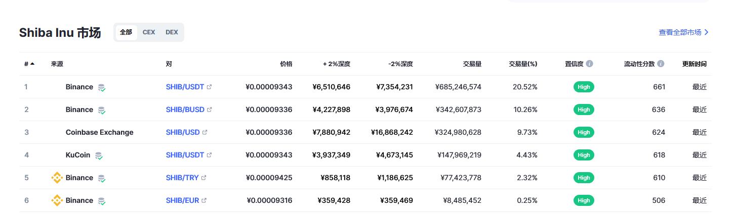 如果您想知道以当前价格在哪里购买SHIB币,目前 Shiba Inu 交易量**的平台为 Binance, BTCEX, Deepcoin, Bitrue。 您可以在我们的加密交换页面上找到其他列表。