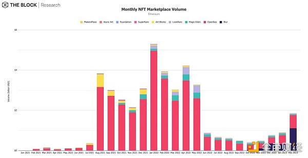 5、二月以太坊链上市场交易额达到了18.6亿美元,涨幅高达103.2%,这种上涨态势主要由市场Blur推动,随着其BLUR**推出,Blur在交易量等指标上已超越了OpenSea。