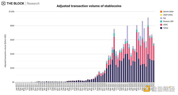 2、调整后的稳定币链上交易额减少至5581亿美元,跌幅达到了17.6%;已发行稳定币供应量则进一步收缩至1284亿美元,降幅约为3.2%,其中美元稳定币USDT和USDC的市场份额分别上升至 55.7%和31%。另一方面,纽约州金融服务部命令Paxos Trust Co.停止发行更多的BUSD**之后,已有价值约56亿美元的BUSD被销毁。