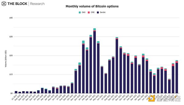 12、在加密货币期权方面,比特币和以太坊期权持仓量也都出现上涨,但涨幅较一月有所减少,其中比特币期权持仓量涨幅为3.3%,以太坊期权持仓量涨幅为18%。比特币和以太坊期权交易额同样普涨,其中比特币期权交易额在二月份增长了10%,达到176亿美元;以太坊期权交易额涨幅为22.4%,达到104亿美元。