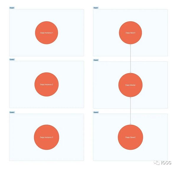 跨链通信拥有强大的自定义性。开发者**可以基于跨链通信开发全链 DApp。DApp 构建者希望在不同链之间传递消息并获取必要的区块信息。有了这些的特性,全链 DApp 的构建范式从互不通信,转向分布式的设计。在互不通信,相互独立的模型中,不同链上的 Dapp 实例无法彼此共享数据。在分布式设计中,Dapp 实例可以相互通信,并可以定期将数据同步到一个实例。该实例获取所有数据并可以修改其他实例上的参数。