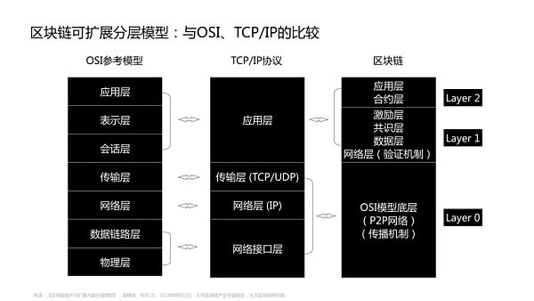互联网最经典的分层是OSI七层模型,区块链的分层模型也有很多种,比较典型的是六层(多出来的**层是因为区块链本身就依赖于互联网为它工作)。
