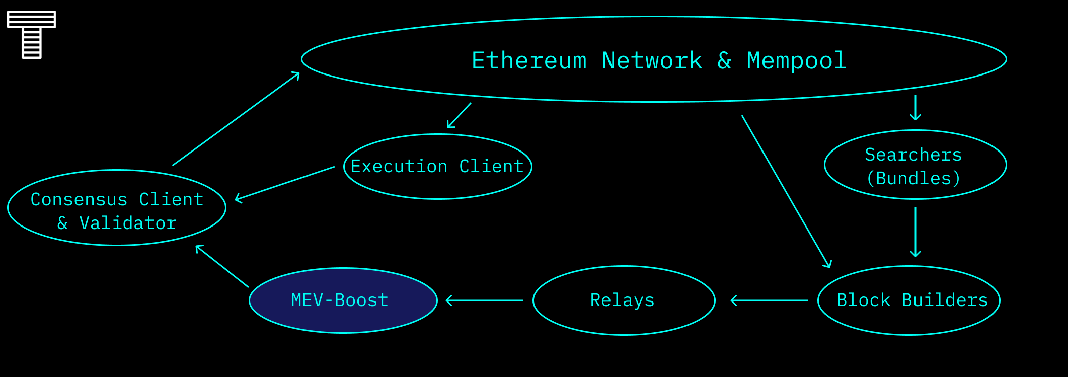 MEV-Boost 分离了 PoS 验证者的角色:区块建设和区块提议。Searcher(独立的网络参与者,他们在区块链上寻找 MEV 机会而得名)向区块建设者发送捆绑交易,有时他们自己也是区块建设者。