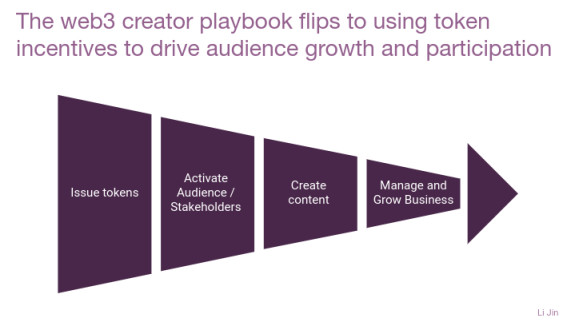 Web3 模型参考了 Web2 创作者剧本,并将其反转。Web3 创作者不是从创建免费内容开始努力建立一个可以在以后货币化的庞大粉丝群,而是通过创建**(NFT 或可替代**)开始货币化。这吸引了对资产所有权感兴趣的粉丝成为初始受众。然后,创作者可以使用**销售的初始资金和利益相关者来引导他们的创意工作。粉丝可以参与其中,看到创作者取得成功,并被激励成为创作者及其作品的传道者。这有助于促进内容创作、受众增长和货币化的良性循环。