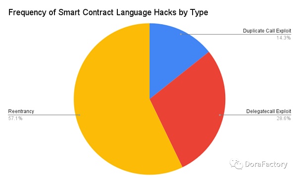 智能合约语言级别的漏洞利用是最罕见的。该数据集始于 2020 年,当时该类别中的大多数漏洞利用已经广为人知,并且很可能很早就被发现。