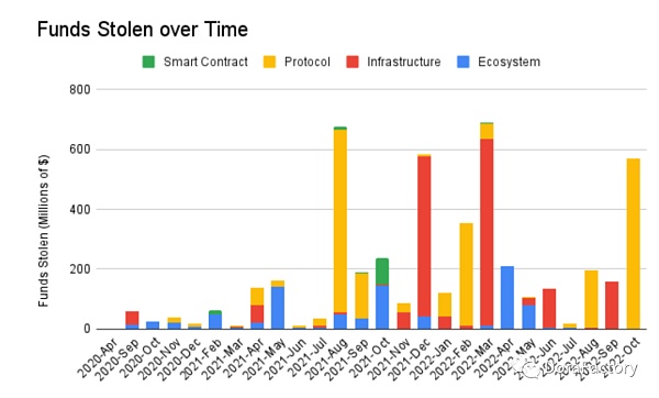 随着时间的推移,被盗资金的分布有四个主要峰值。2021 年 8 月有一个高峰,这是由 Poly Network 黑客驱动的。2021 年 12 月,由于大量基础设施黑客攻击导致私钥遭到**,例如 8ight Finance、Ascendex 和 Vulcan Forged,又出现了另一次高峰。然后,由于 Ronin 黑客攻击,我们看到了 2022 年 3 月的历史新高。**的峰值是由BNB bridge被攻击引起的。
