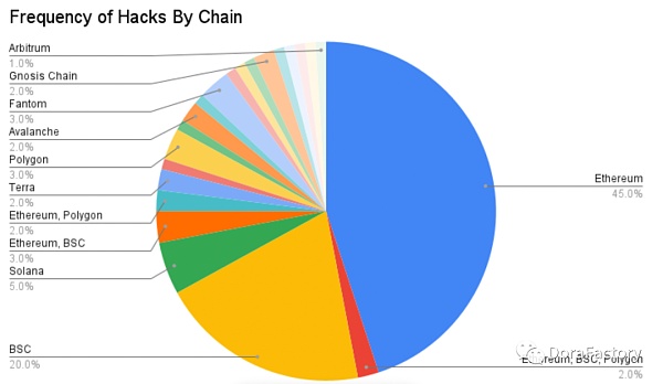 根据托管资金被盗的合约或钱包的链来分割数据集。以太坊的黑客数量最多,占样本组的 45%。BIAN智能链(BSC)以 20% 位居第二。