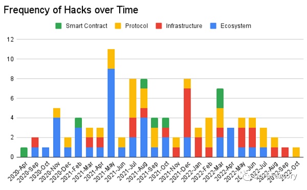 2021 年 5 月是生态系统攻击的历史新高。2021 年 7 月的协议逻辑攻击最多。2021 年 12 月发生的基础设施攻击最多。很难判断这些集群是否是巧合,或者它们是否是一个成功的成功案例,激励同一演员或其他人专注于特定类别。