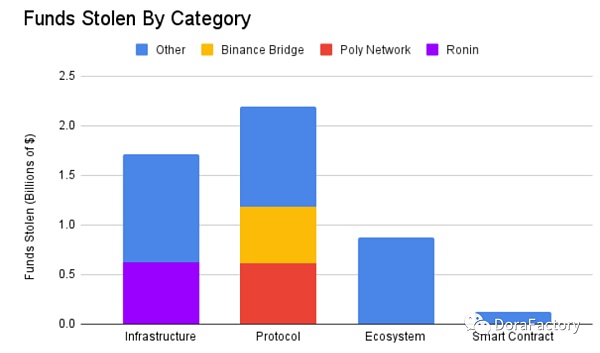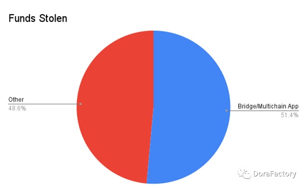 涉及跨链桥或多链应用的黑客(如多链交换或多链借贷)对数据集有巨大影响。尽管只占事件的10%,这些黑客占了25.2亿美元的被盗资金。